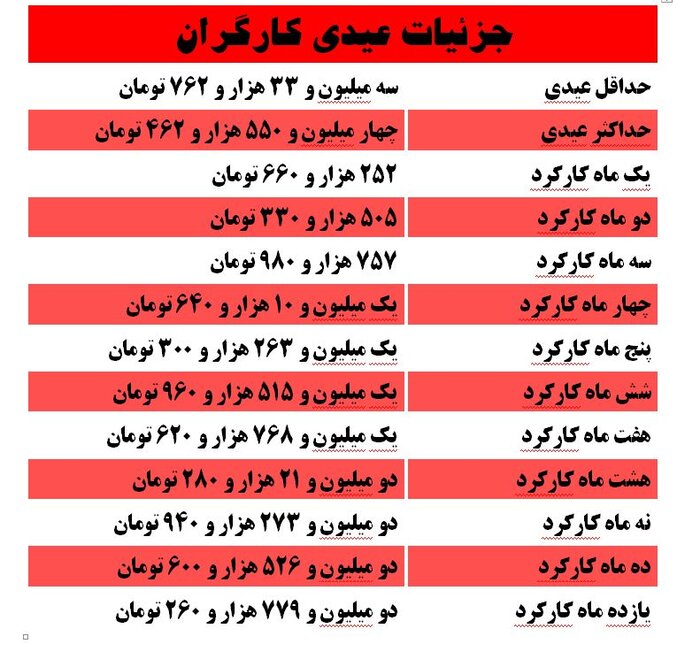 علی خدائی، نماینده کارگران در شورایعالی کار : مطالبات قانونی کارگران مشمول مرور زمان نمیشود، هرگونه تخلف کارفرمایان در مورد دستمزد، عیدی و پاداش در سالهای بعد قابلپیگیری است. عیدی و پاداش توافقی نیز علاوه بر اینکه یک تخلف مشهود از قانون تلقی میشود، درنهایت میتواند به زیان کارفرما تمام شود. با توجه به حداقل دستمزد یکمیلیونو۹۱۰هزار و ۴۲۷تومانی کارگران در سال۹۹، امسال تمام کارگران مشمول قانون کار بین ۳میلیونو۸۲۰هزار تومان تا ۵میلیونو۷۳۱هزار تومان عیدی خواهند گرفت./همشهری [ جمعه سوم بهمن ۱۳۹۹ ] [ 23:56 ] [ رادمهر ]